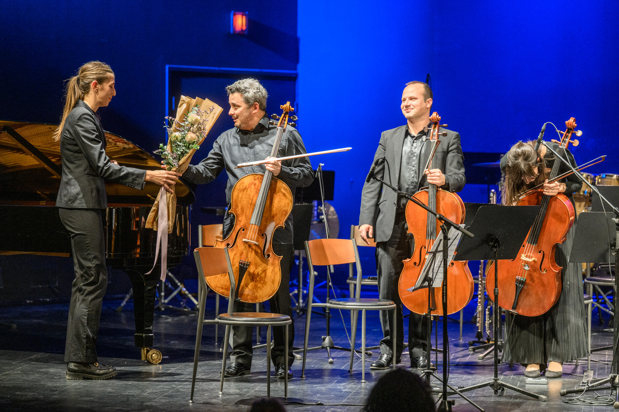 Nakon Ravela kao vrhunca prvog dijela večeri, u drugome dijelu nastavljeno je usložnjavanje izričajnih specifičnosti novih triju skladateljskih ostvarenja. Početak nastavka pripao je Pierreu Boulezu, još jednom kultnom imenu glazbe 20. stoljeća, čija je Messagesquisse svojevrsni „rođendanski telegram“ posvećen dirigentu Paulu Sacheru. Ova skladba dovela je na pozornicu za većinu Cantusovih koncerata neuobičajen ansambl sastavljen od istovrsnih glazbenika – sedmero violončelista. Prvi među njima istaknuo se dugogodišnji Cantusovac Jasen Chelfi kojemu je, kako Boulezova skladba nalaže, povjerena solistička uloga. Međutim, ta uloga nije od početka evidentna, već postaje jasnija kako se skladba otvara. Kao prvi među jednakima, održavajući konstantni glazbeni puls Chelfi je postepeno preuzimao sve veću odgovornost unutar glazbenog tkiva i pretvarao se u pokretački pogon čitavog violončelističkog ansambla, koji ga je slijedio, podupirao i nadograđivao od početka do kraja Boulezove energične partiture.