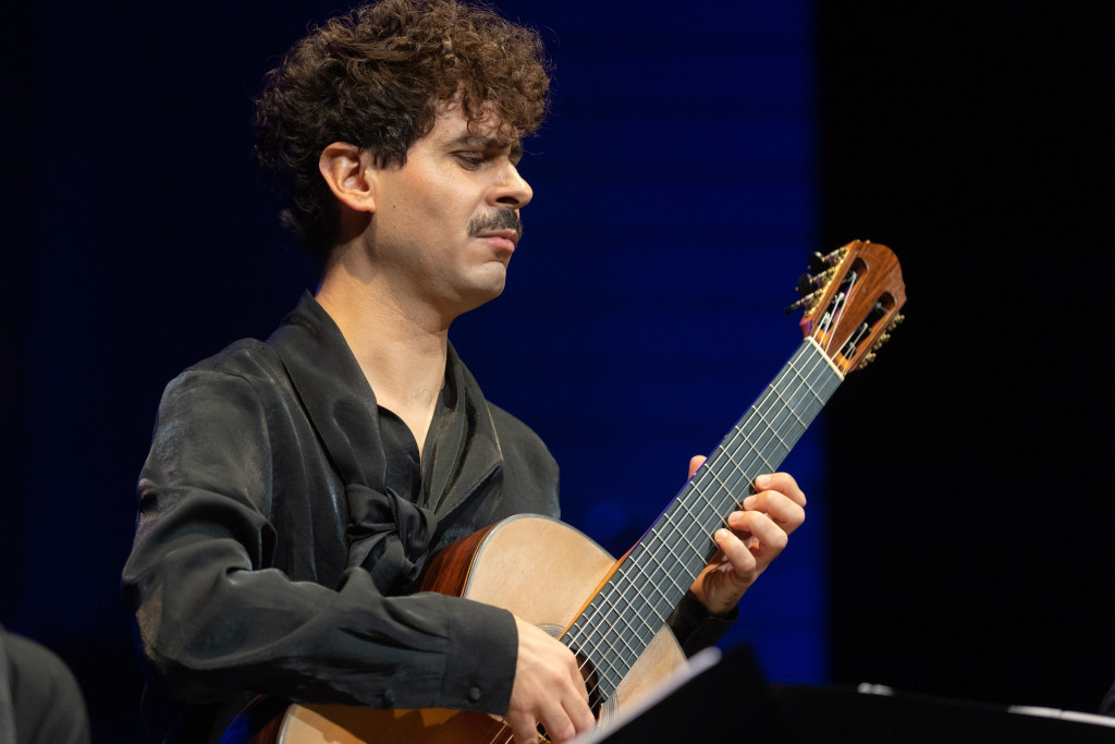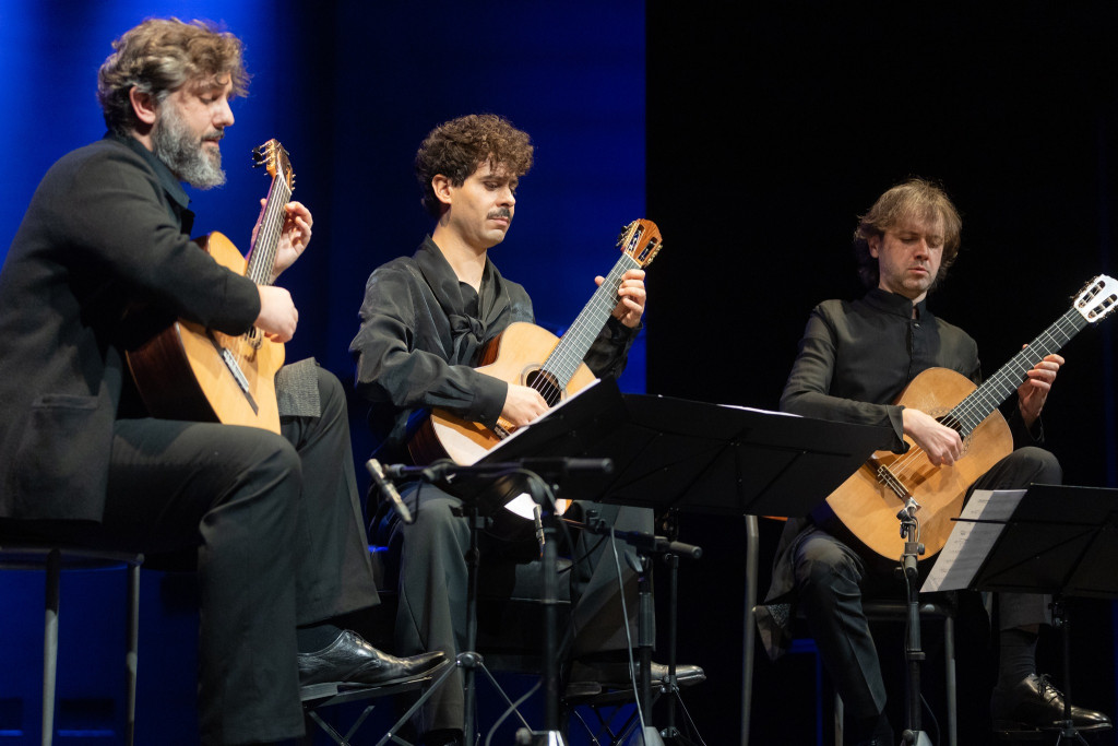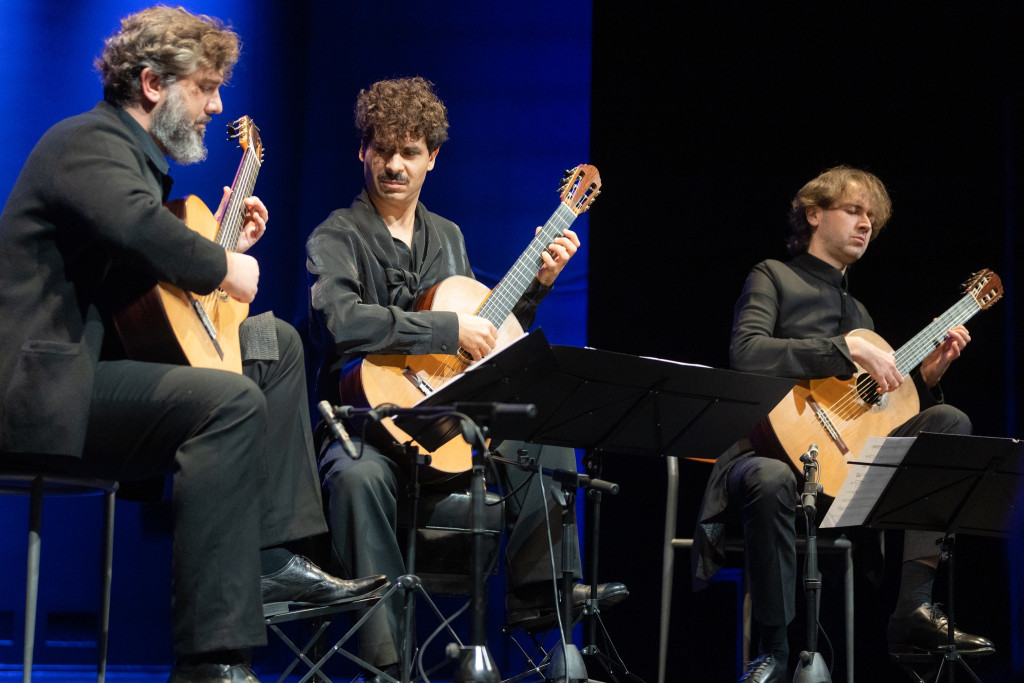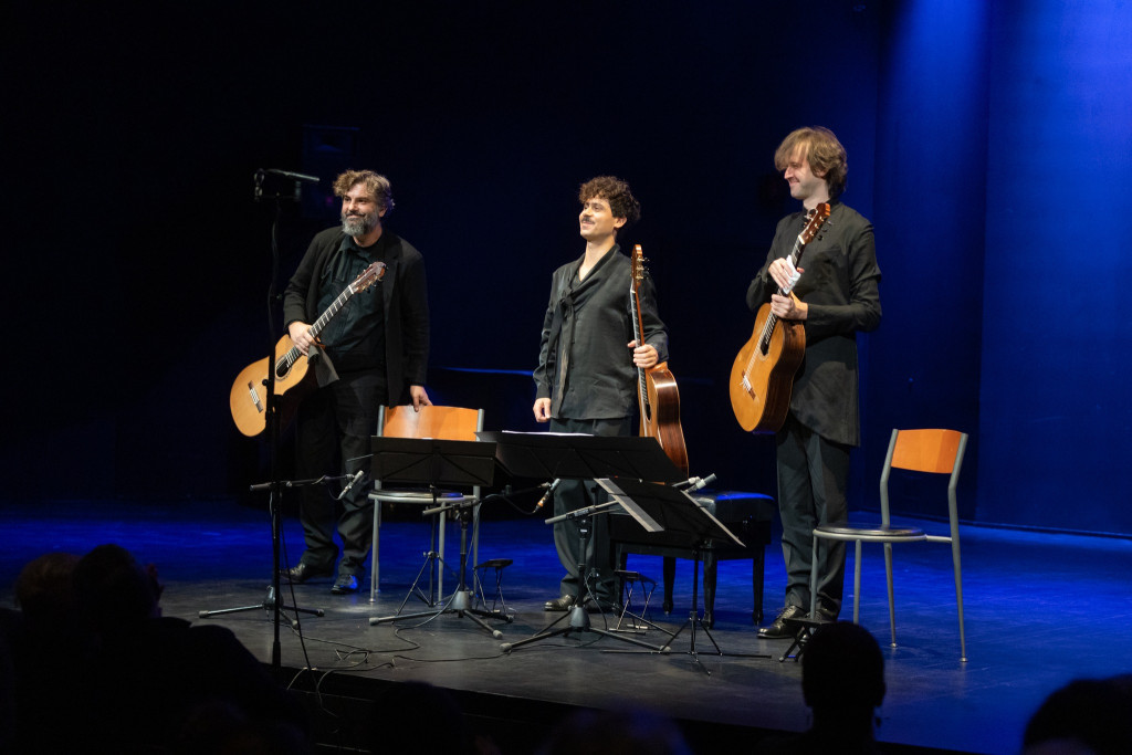 Trostruka „neman” s tri glave i šestoro ruku u Triju Elogio našla je analogiju sa Zagrebačkim gitarskim trijom, pri čemu Portugalac Pedro Ribeiro Rodrigues u sredini zamjenjuje poziciju Istvána Römera, Tomislav Vukšić na lijevo je njegov profesor Darko Petrinjak, dok poziciju na desno drži Petrit Çeku. Svaki u svojim gabaritima preuzetom uzoru dodaje svoj identitet u zvuku i gesti, dok ponovno nastavljaju tradiciju svojih prethodnika. Ponosno je u publici koncert pratio i „profesor svih profesora” gitare u Hrvatskoj, prošlog proljeća ovjenčan Nazorom za životno djelo, gitarski mag Darko Petrinjak, koji nije skidao smiješak zadovoljstva skriven ispod pustinjačke brade.