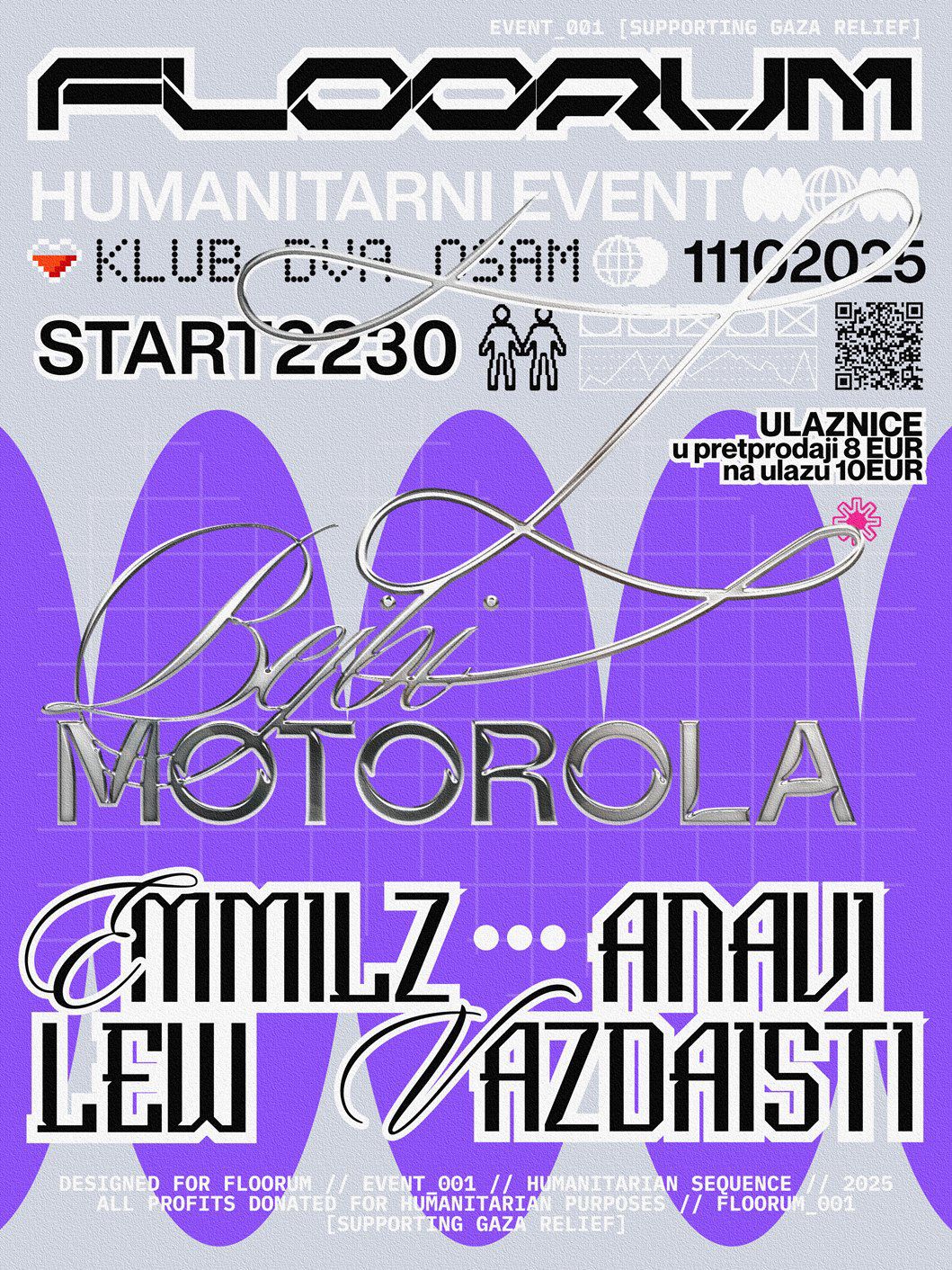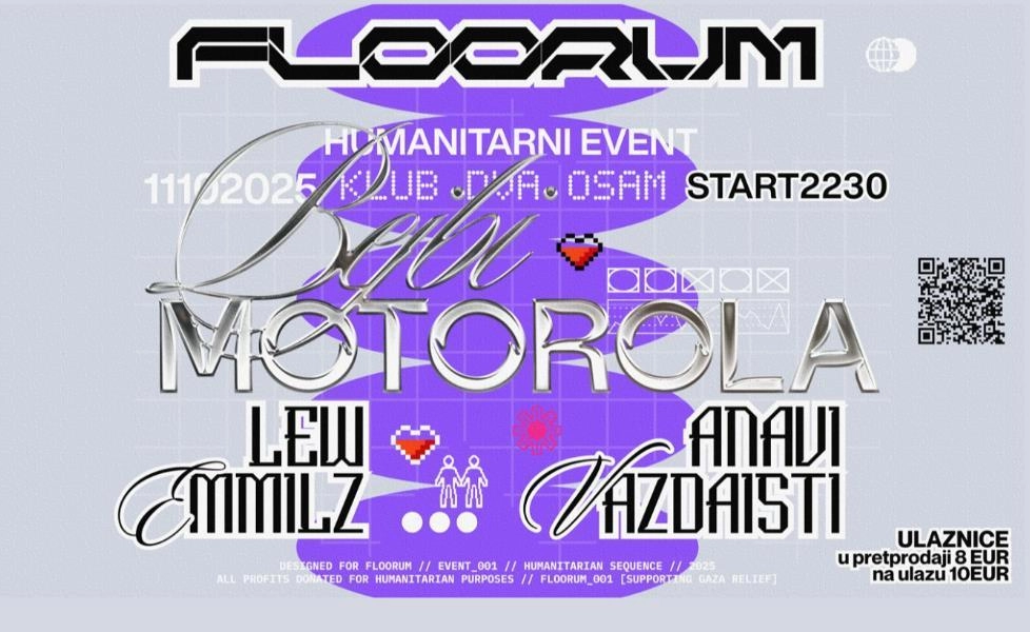 Prvi FLOORUM event održava se 11.10.2025. od 22.30h u klubu Dva Osam u Zagrebu, a nosi snažnu humanitarnu dimenziju: sav prihod od ulaznica bit će doniran za pomoć Gazi i palestinskom narodu putem Launch Good Fundacije . Time želimo pokazati da se i kroz noćni život može širiti solidarnost i briga za one kojima je najpotrebnije.