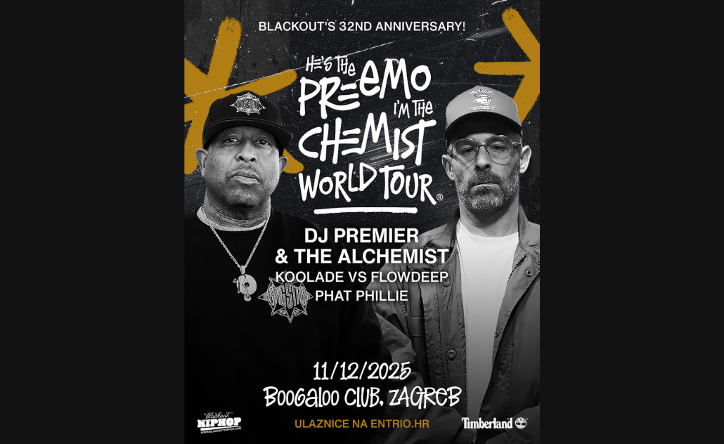 Ovim koncertom obilježava se 32. rođendan legendarne hip-hop emisije Blackout, koja je 17. studenoga 1993. prvi put emitirana na zagrebačkom Radiju 1, pod vodstvom DJ Frxa i Phat Phillieja. Jedan od povoda slavlju je i novoostvarena suradnja Blackouta s Timberlandom Hrvatska. Jedan od najvećih svjetskih streetwear brandova, neizostavni je modni element repera diljem svijeta. Novi globalni Timberlandov brand ambasador legendarni je njujorški režiser i aktivist, Spike Lee, čiji su filmovi “Do The Right Thing”, “Malcom X”, “Jungle Fever”, “Crooklyn” bili velika inspiracija hip-hop kulturi diljem svijeta. Spikeov dugogodišnji prijatelj i zagrebački gost DJ Premier radio je glazbu za nekoliko njegovih filmova kao što su “Mo’ Better Blues” i “Clockers” pa u tom smislu suradnja Timberlanda i Blackouta nije mogla imati bolje protagoniste. Svi putevi vode 11. prosinca u Boogaloo, osigurajte svoje ulaznice na vrijeme!