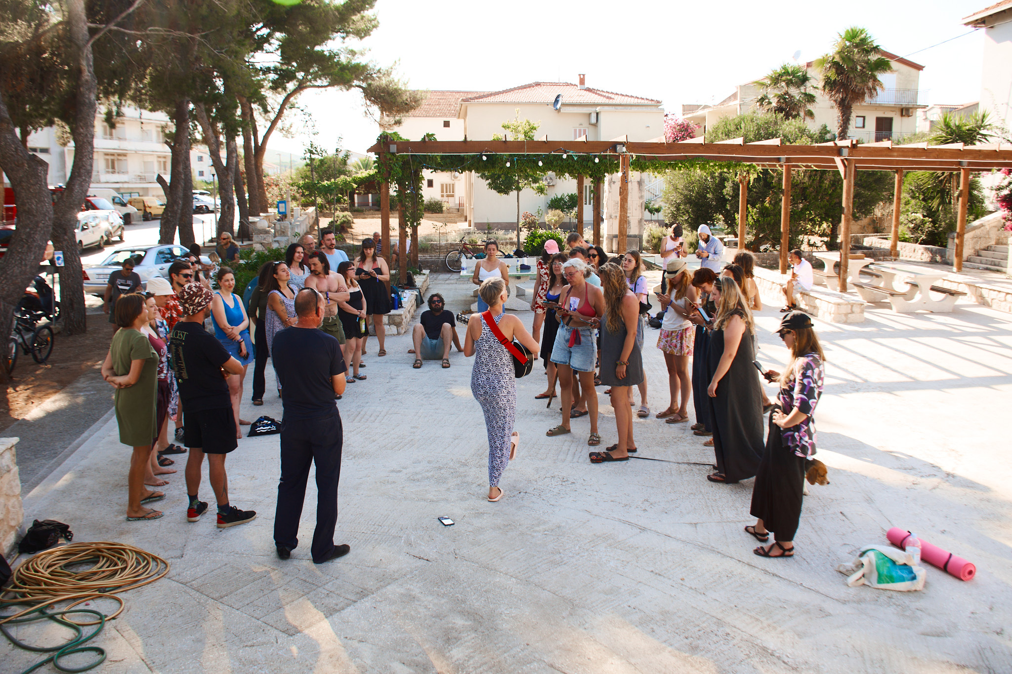 Festival i dalje živi po cijelom mjestu. Glavna pozornica, lokacije u staroj jezgri Sućurja, kamp među borovima kraj plaže Česminice. Kamp ostaje srce iskustva: veganski obroci od lokalnih namirnica, hlad borova, more na korak, tuševi i čista voda.