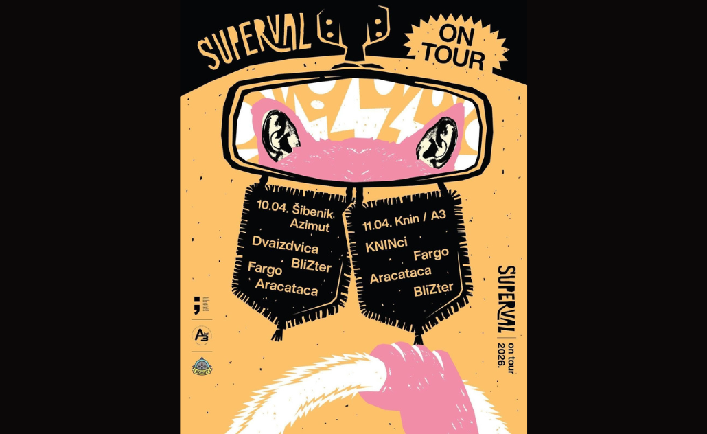 Nakon odličnih nastupa u Karlovcu i Splitu proteklog vikenda, 20. i 21. ožujka, Superval nastavlja turneju po Hrvatskoj! Sljedeći su na redu Šibenik, gdje će se 10.4. u Azimutu predstaviti Dvaizdvica, BliZter, Fargo i Aracataca, te dan kasnije Knin, u kojem će 11.4. u klubu A3 zasvirati KNINci, Fargo, Aracataca i BliZter