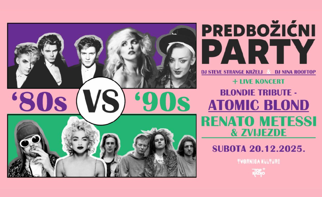 Dvoboj godine sprema se u Tvornici kulture – Predbožićni party: 80s vs 90s! Ekskluzivni party održat će se u subotu, 20. prosinca 2025. godine, a najveće hitove zlatnog doba na pozornici izvest će Metessi & Zvijezde, dok će new wave glamur servirati vrhunski Blondie tribute bend Atomic Blonde. DJ-evi Steve Strange Krželj i Nina Rooftop pripremit će selekciju najvećih domaćih i stranih hitova 80-ih i 90-ih.