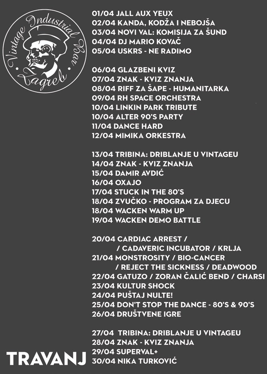 Zagrebački Vintage Industrial Bar u travnju donosi raznovrstan program koji uključuje koncerte domaćih, regionalnih i međunarodnih izvođača, popularne kvizove znanja, tematske slušaone, humanitarne večeri te program za djecu. Publiku očekuje više od dvadeset događanja tijekom mjeseca, s naglaskom na živu glazbu i alternativnu scenu.
