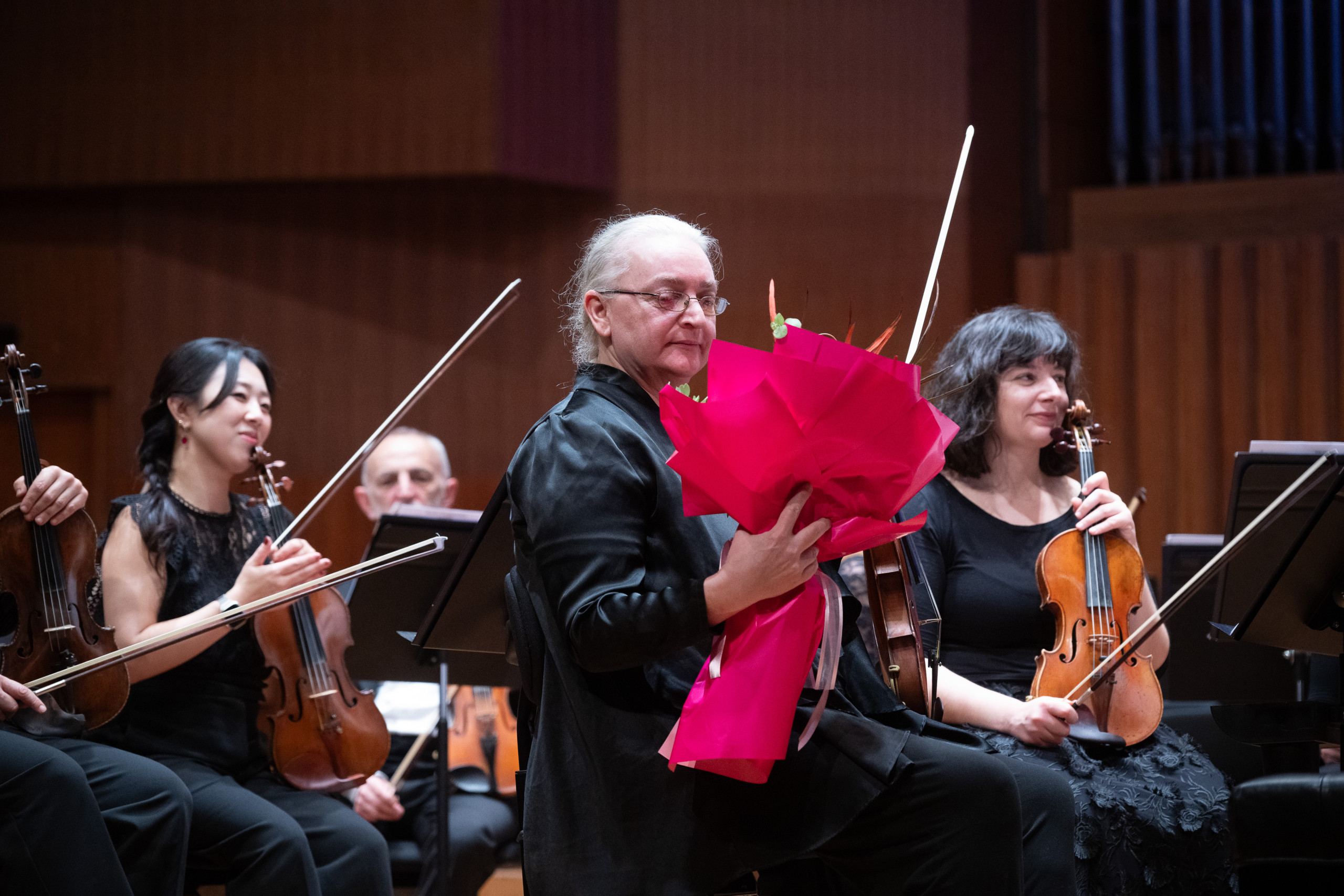 Solističku dionicu izvodi Sidonija Lebar, stalna članica Zagrebačke filharmonije od 1991., a od 1994. njezina koncertna majstorica. Dobitnica je Srebrne medalje u povodu 130. obljetnice Orkestra. Uz bogatu orkestralnu karijeru njeguje i solističku djelatnost – nastupala je s domaćim i stranim orkestrima, održala zapažen recital na Dubrovačkim ljetnim igrama te bila prva violinistica Gudačkog kvarteta Rucner. Njezina dugogodišnja uloga koncertne majstorice na čelu orkestra čija tradicija seže više od 150 godina unatrag, simbol je umjetničke izvrsnosti i snažne prisutnosti žene u samom središtu velike orkestralne baštine.